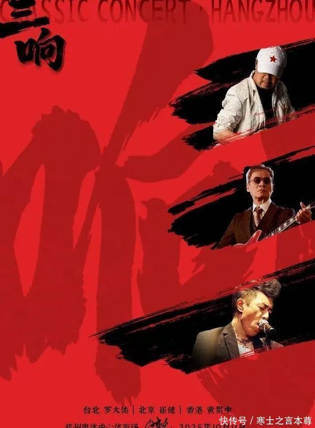▲时光Classic演唱会·三响杭州站海报 而且,真的不要无休止提及情怀这个词,情怀对于如今的罗大佑、崔健和黄贯中来讲,确实是他们和歌迷之间联结的某种记忆纽带。不要试图去嘲笑这一种情怀,没有在《未来的主人翁》里经历过青春的人说了不算,只有在“原谅我这一生不羁风中爱自由”横渡海阔天空青春的人,说了才算! 所以,老人们一定要来,中老年歌迷一定要来,那些还有着梦想,热血还未冷的人,都应该来,来演唱会的现场撒点野,来演唱会的现场嘴巴呼一呼,来演唱会的现场高唱光辉岁月。 年轻人也要来,都是当年的“未来的主人翁”,都挣扎着避免成为电脑儿童,曾经的新歌在多年以后终于“熬”成了那首古老的歌曲,与镜子里年少懵懂自我的对话,也是超越时空的对话。 更何况,陈楚生刚在《歌》里唱了《未来的主人翁》,方大同、华晨宇等一代又一代的歌手也在不停翻唱崔健的歌曲,让摇滚的火种永远燃烧、永远年轻、永远热泪盈眶,更别说《海阔天空》,已经成了几代人以歌言志的BGM。一代人的青春终将老去,但那些关于青春、关于爱情、关于理想的旋律,又是所有人青春里永恒的主题,永不会老去。 朋友们,让我们相聚在 10日杭州的大莲花 ,相会在 “时光Classic演唱会·三响杭州站” 罗大佑、崔健和黄贯中合体的现场,他们是活的化石,是躁动的殿堂,他们是彼此的嘉宾,是对华语流行音乐人文时代和摇滚现场经典岁月的再一次激活。 无须点歌,首首经典,从《不是我不明白》到《爱的箴言》,从《海阔天空》到《从头再来》,从《野百合也有春天》到《岁月无声》…… 岁月无声也有声,呯!呯!呯!那是大莲花的三响,在叙说着华语流行音乐曾经的荣光,他们是罗大佑、崔健和黄贯中,他们是第一次在演唱会上合体,也可能会是未来你我的独家记忆!